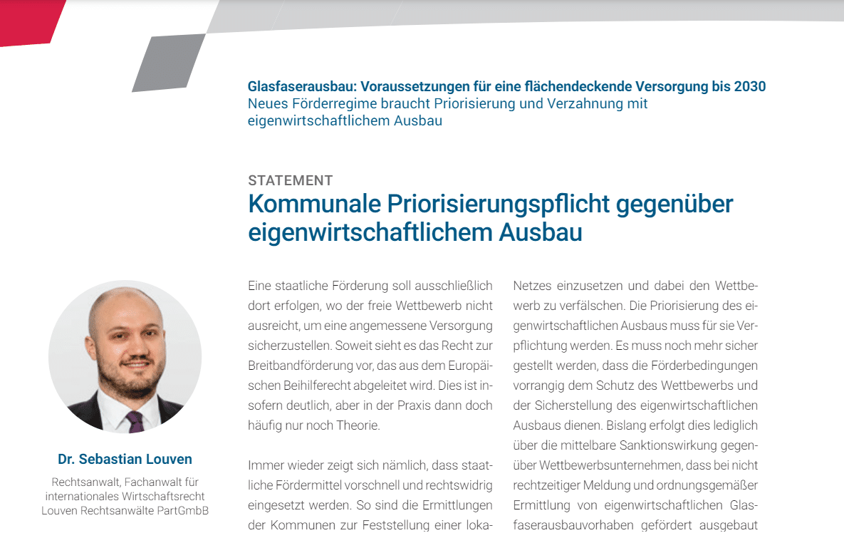 Ein solcher Beitrag findet sich auch von mir in diesem Bericht auf Seite 36. Unter dem Titel “Neues Förderregime braucht Priorisierung und Verzahnung mit eigenwirtschaftlichem Ausbau” greife ich einige wenige Probleme beim aktuellen Förderausbauregime heraus und schlage Änderungen vor. Hauptsächlich geht es darum, dass einige Gebietskörperschaften einen geförderten Ausbau auf jeden Fall druchbringen wollen und sich etwa auch schon seit mehreren Jahren auf einen bestimmten Betreiber festgelegt haben. Spezifisch aus der Praxis ist mir dabei das Problem der “vorweggenommenen” Auswahlverfahren bekannt. Eigentlich aber muss der eigenwirtschaftliche ausbau Vorrang haben.